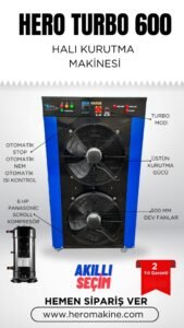 Hero halı kurutma makineleri güçlü fan sistemi ve dayanıklı gövde yapısı sayesinde işletmelere yüksek performans sunar.